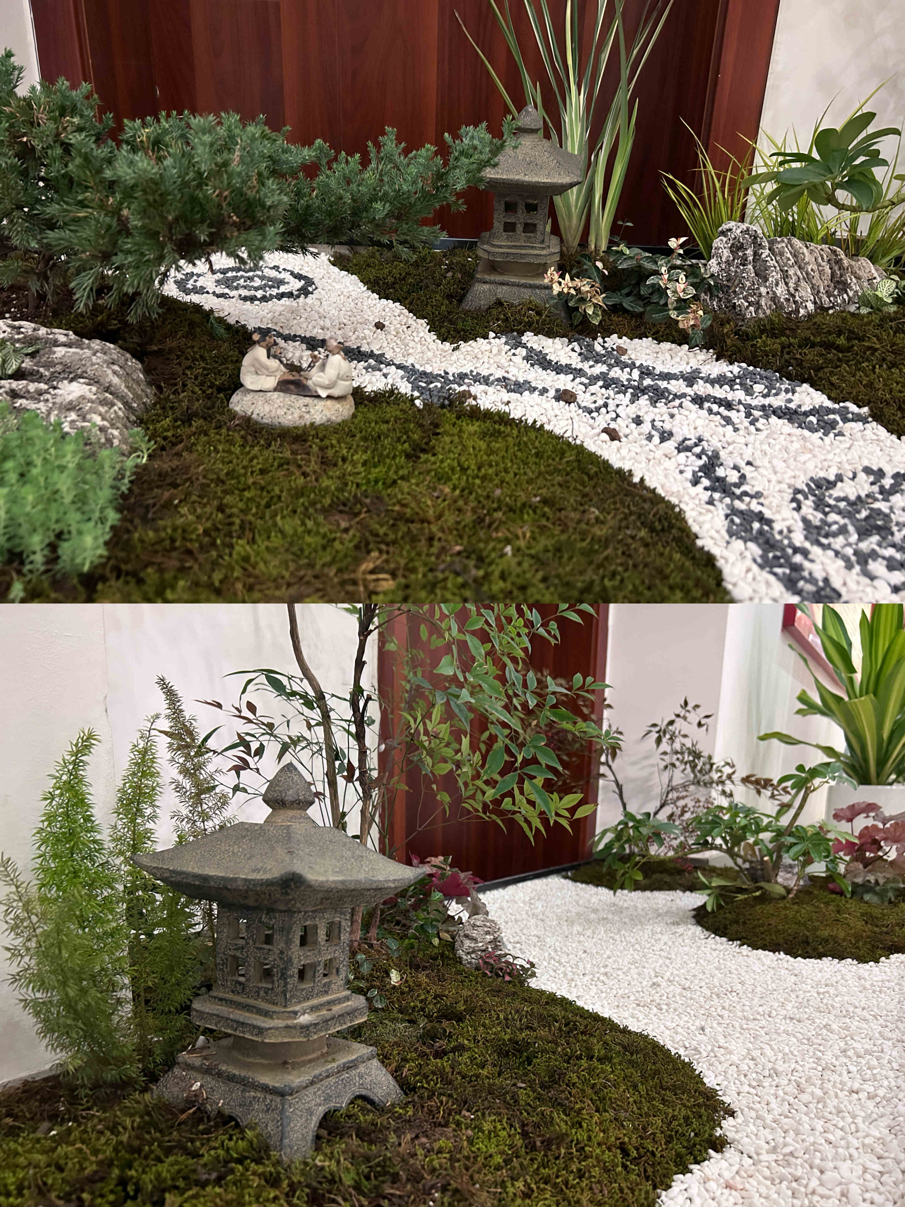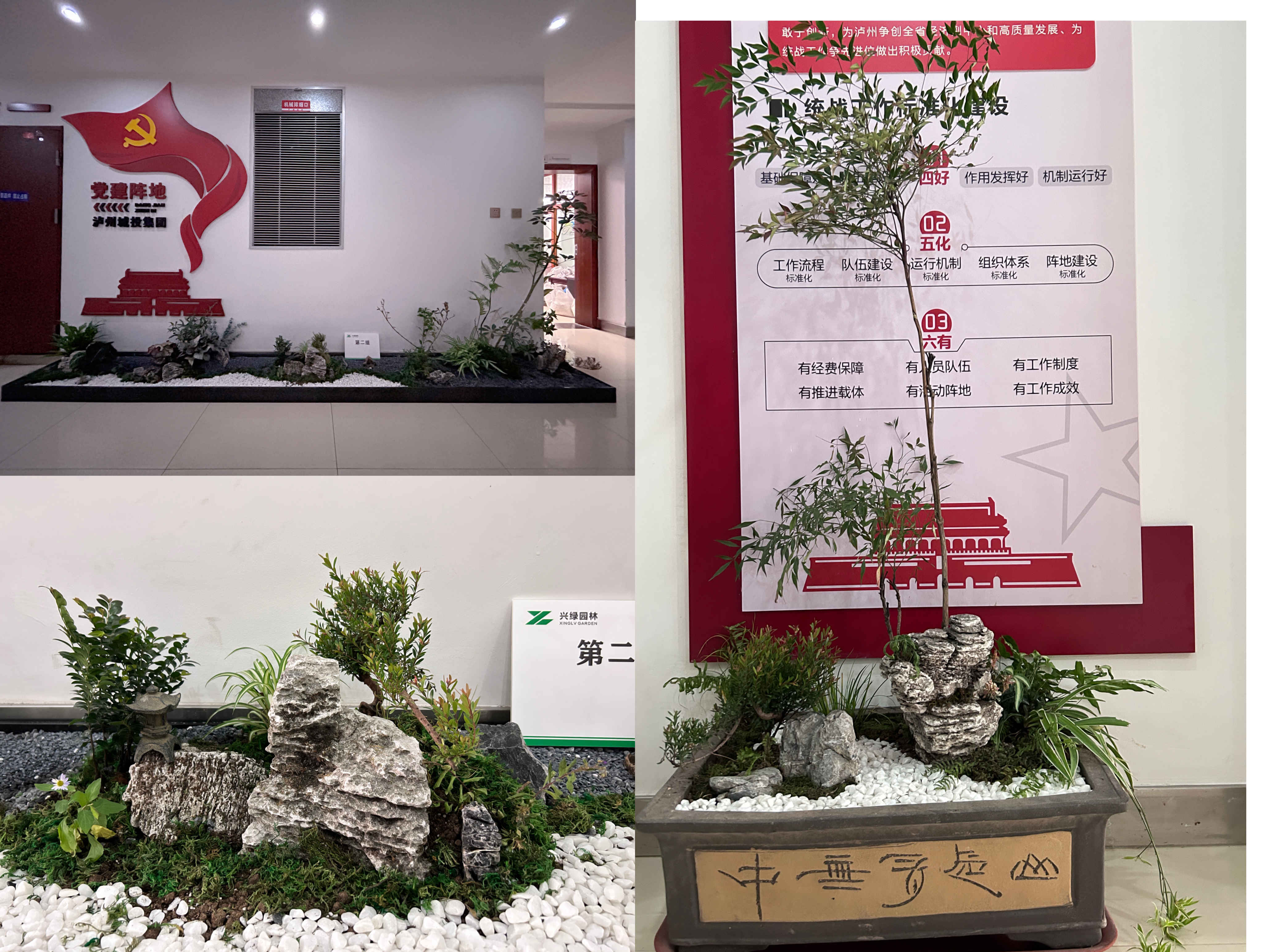 本次大賽共分5個組參賽,全體職工通過抽簽進行分組和選取場地。大賽第一階段,各小組積極討論方案設計、選擇造景材料;大賽第二階段,各小組充分發(fā)揮自己的動手能力,從基層處理、放線布局、掇山理石、堆坡造型到植物栽植、修剪成型,工完場清,每個過程都專注而有條理。選手們各顯身手、較好地利用了山石紋理和形態(tài)、植物的形色進行創(chuàng)作,完成的作品主題突出、構圖優(yōu)美、意境深遠,用“以小見大”的山水園林意境展現興綠園林人對開拓公司美好征程的雄心壯志。