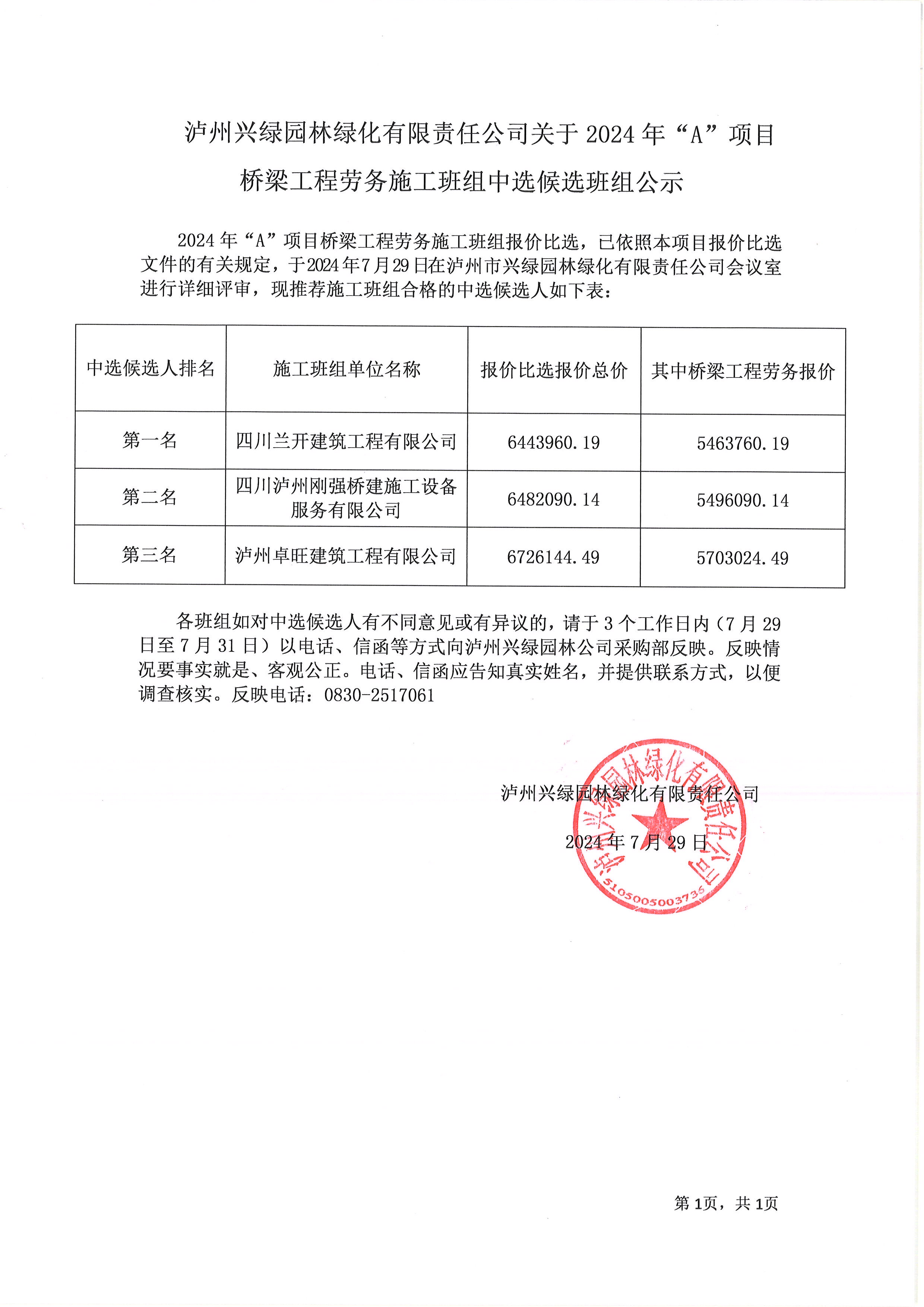 瀘州興綠園林綠化有限責任公司關于2024年“A”項目橋梁工程勞務施工班組中選候選班組公示