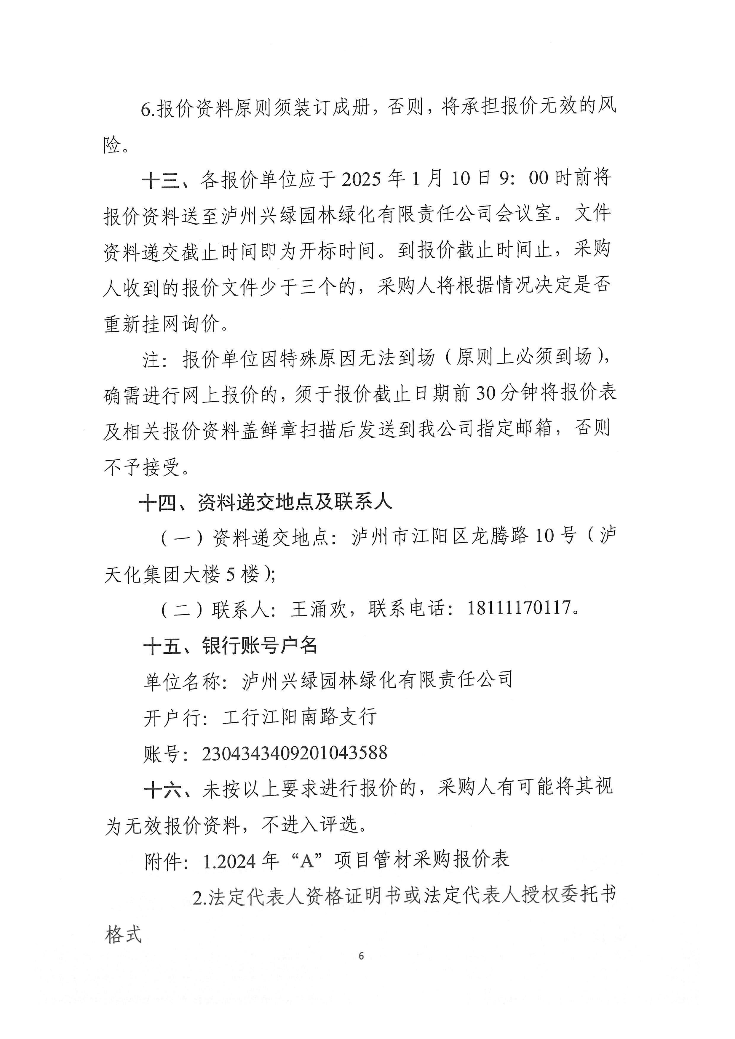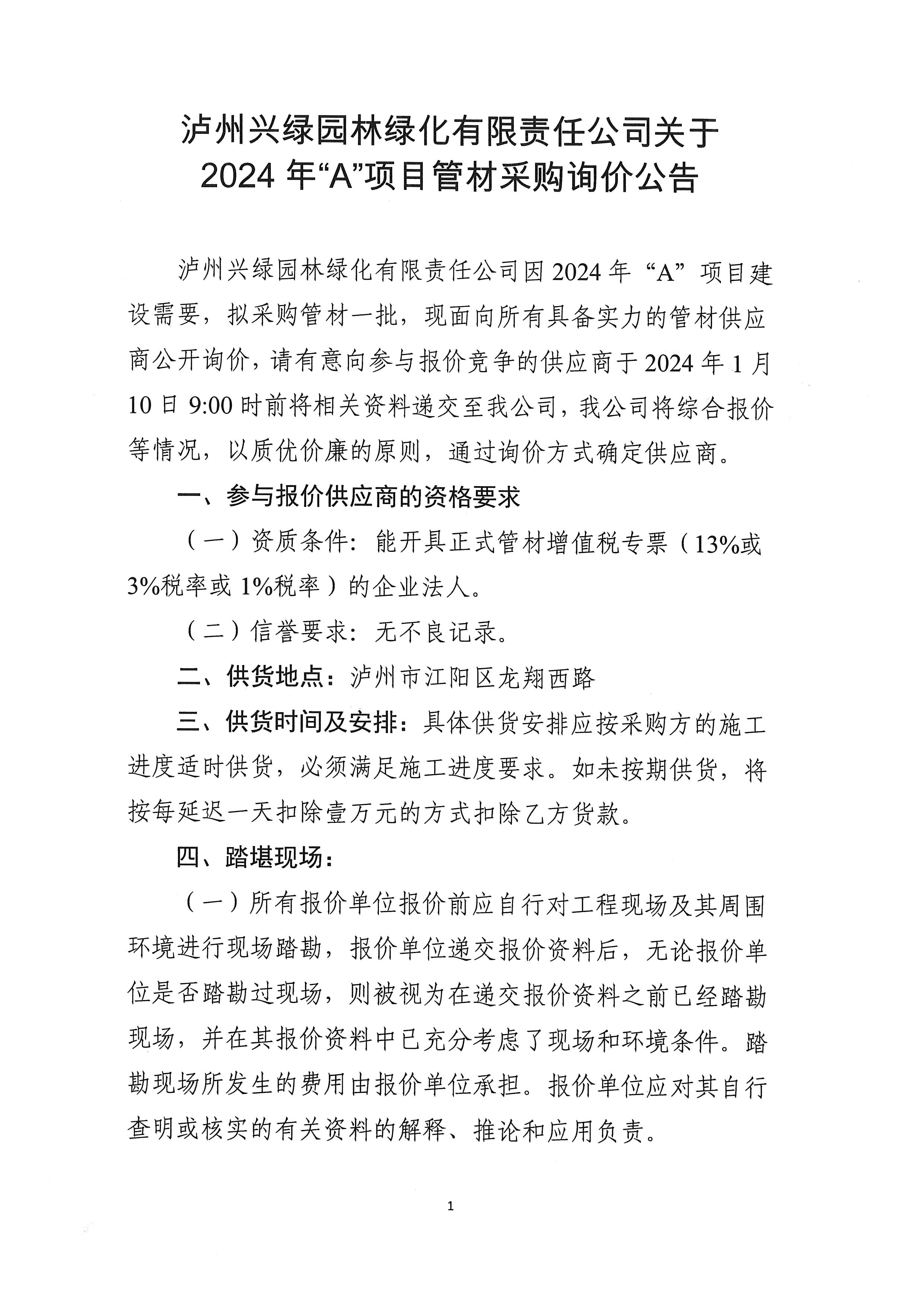 瀘州興綠園林綠化有限責(zé)任公司關(guān)于2024年“A”項(xiàng)目管材采購詢價(jià)公告