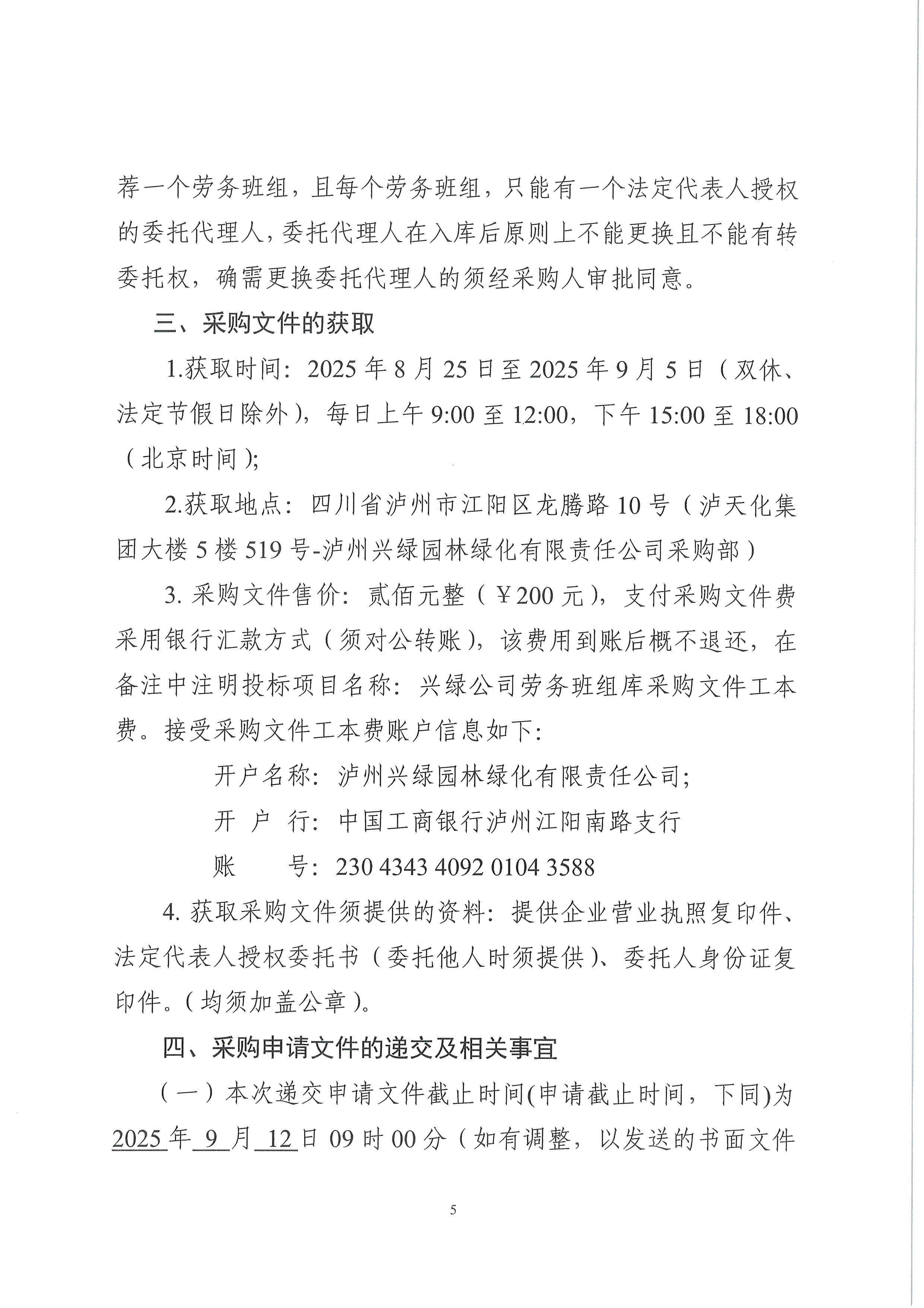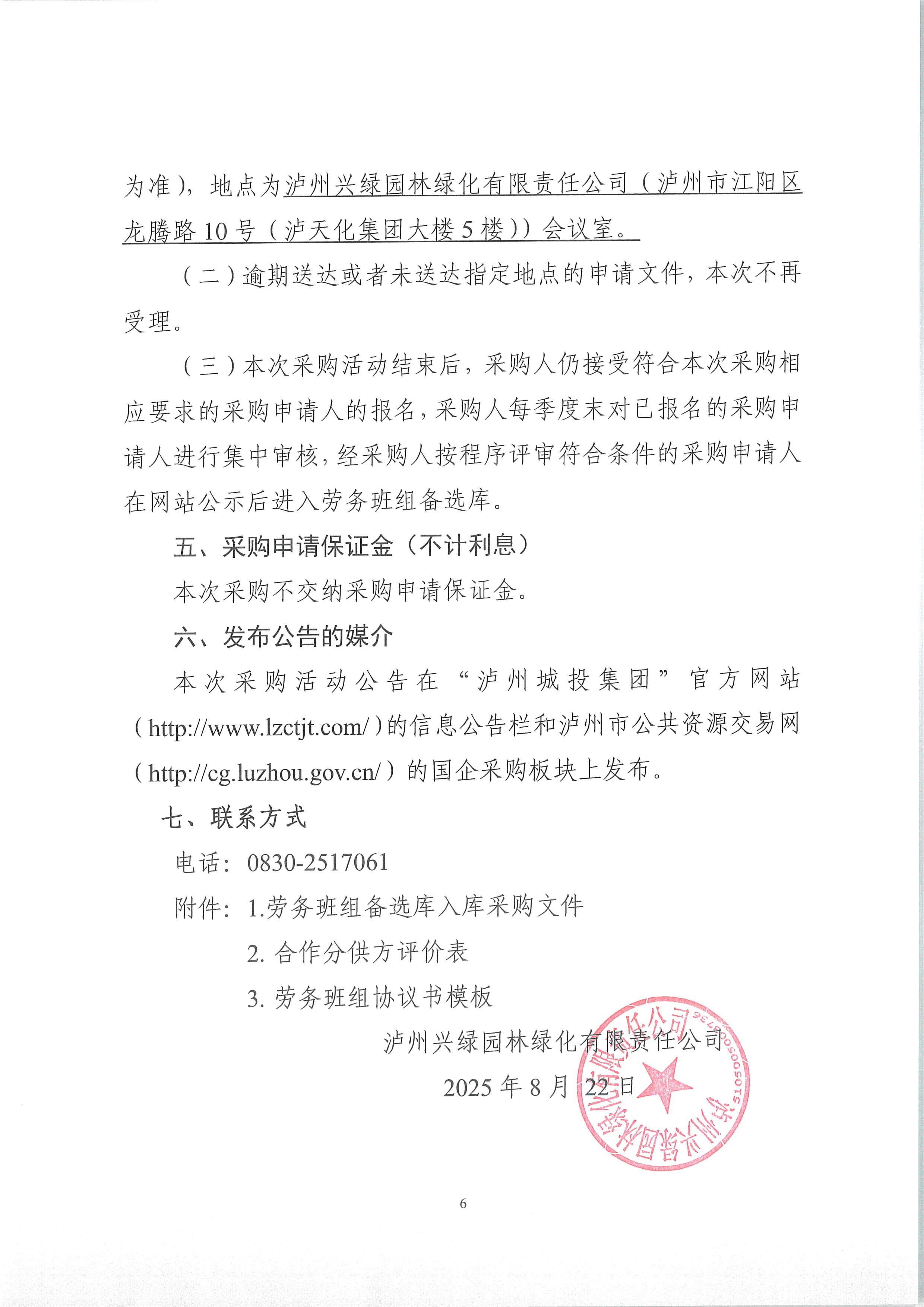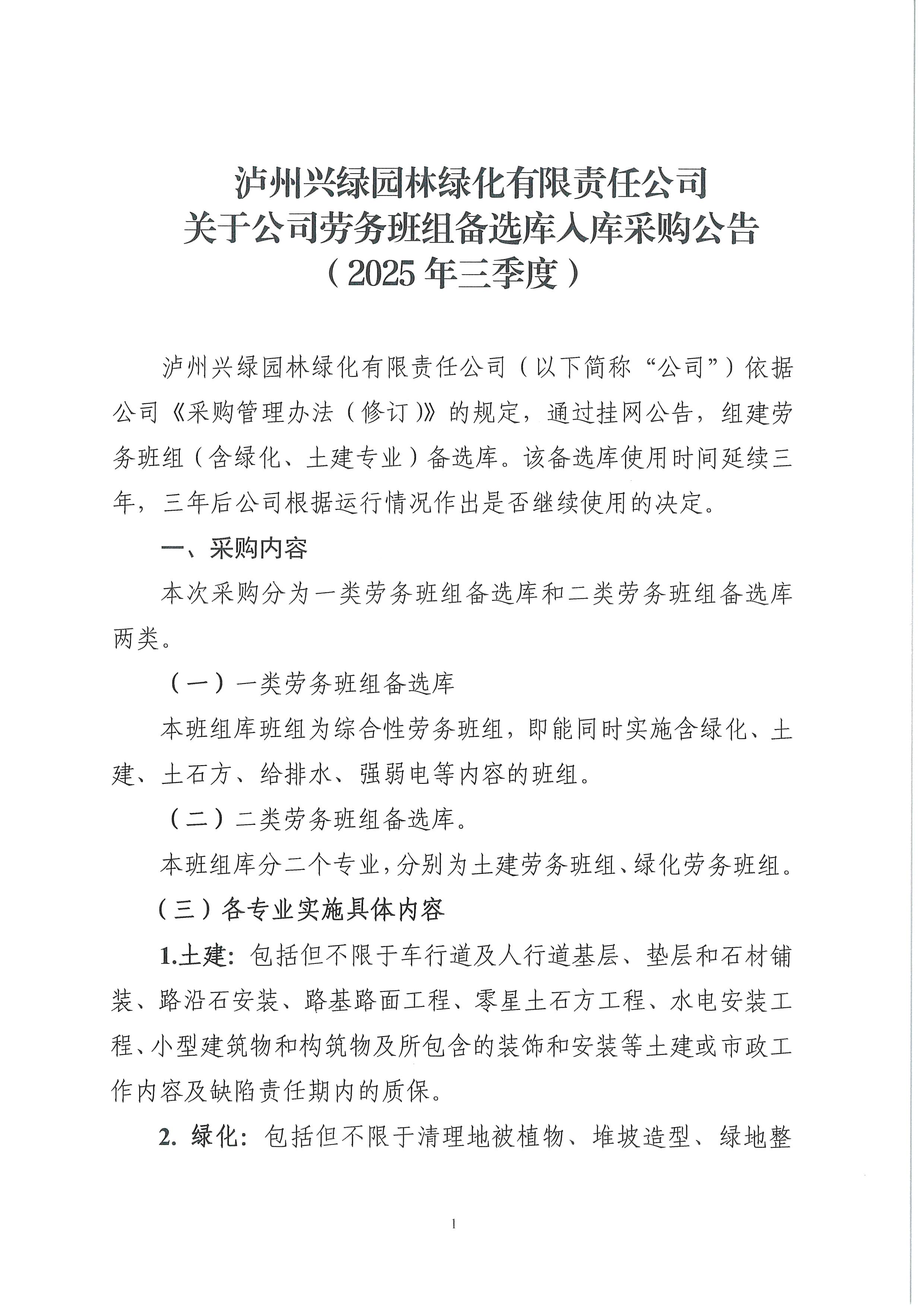 瀘州興綠園林綠化有限責任公司關于公司勞務班組備選庫入庫采購公告(2025年三季度)